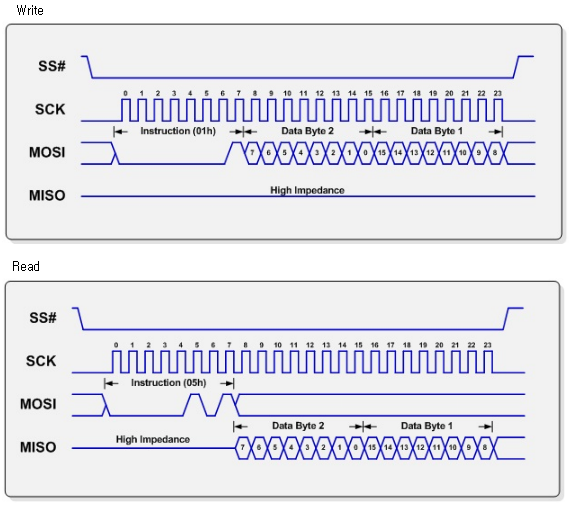 - SPI의 데이터 송수신은 동시에 이루어지기 때문에 데이터 송신이 곧 수신이 된다. 이 데이터 송수신의 타이밍을 결정짓는 것은 Master장치이다.